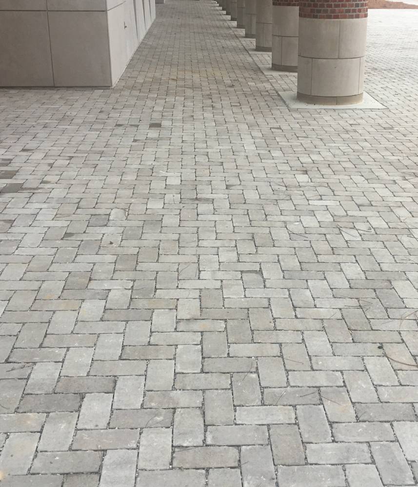 High-traffic courtyards and entryways using industrial-grade pavers that resist staining.